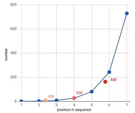 这样,我们求得的几何平均值就变成了这一组数据居中的那个,事实上,这个平均值正是这一序列的中位数。