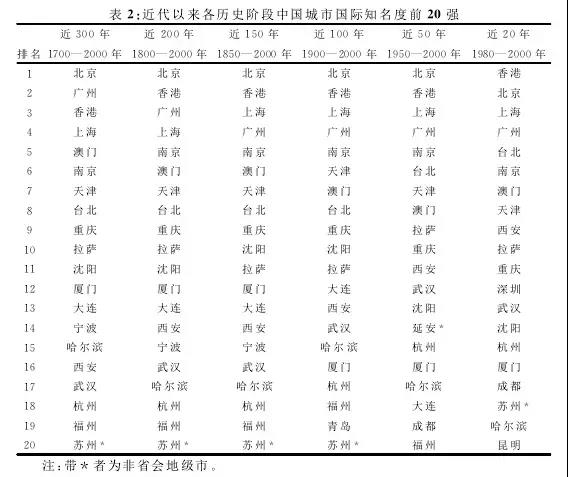 本文首先对294个城市近300年、200年、150年、100年、50年和20年的国际知名度指标进行分段分析(均截至2000年),计算出平均知名度来进行排名。从表格中可以看出,近300年、200年、150年、100年、50年(1949年之后)和20年(改革开放后)等六个不同历史跨度的国际知名度前20强均集中在25座城市。这表明,城市国际知名度本身是较为稳定和集中的指标,尽管300年来经历了清、中华民国和新中国三个政权,但知名城市的构成并无太大变化。